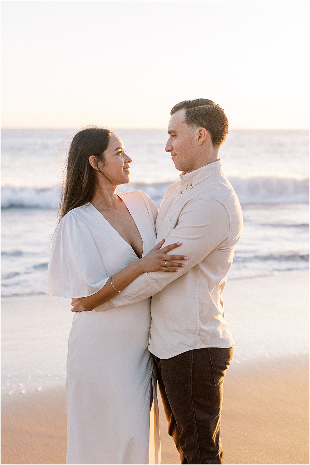 Maria & Connor wanted their session to feel natural and romantic – nothing too posed, just them and maybe a few photos with their sweet dog, Kygo. Between their laughter, Kygo running in & out of the waves and the quiet in-between looks, every photo felt like a glimpse into their story. These are always some of my favorite parts of a session, when the laughter fades into calm and the couple just melts into the setting. Leo Carrillo has this peaceful energy at sunset that makes those sitting-on-the-sand moments feel effortless and romantic.